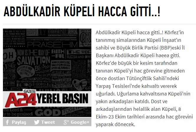 Firma Sahibimiz Abdulkadir Küpeli Hac Yolculuğunda (Gazete A24, 10.10.2013)